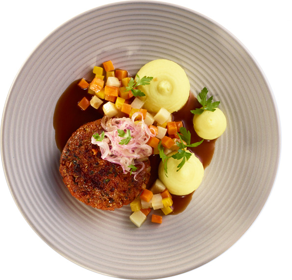 Steak haché THE GREEN MOUNTAIN maison au jus de thym, purée de pdt et légumes racines