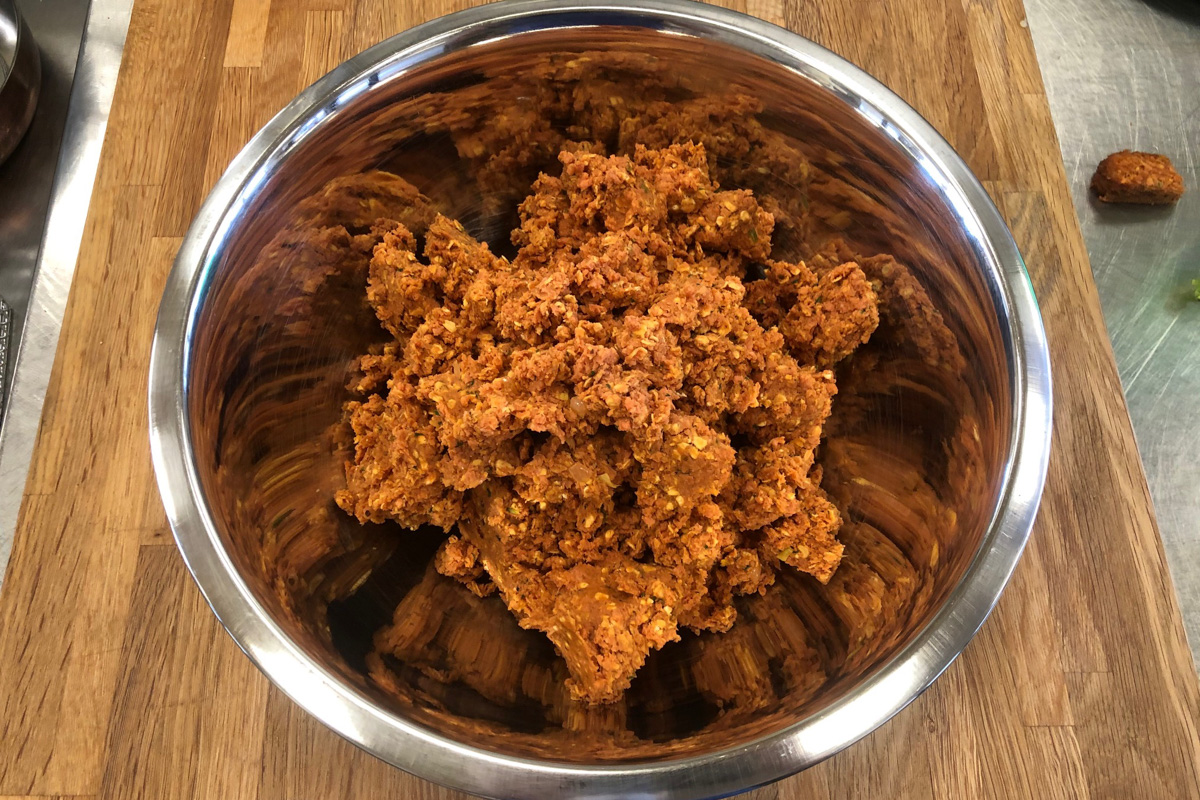 • Incorporer la masse Planta avec le hachis vegan et mélanger.